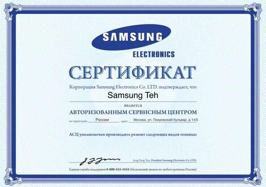 Пользуясь сервисами http://samsung-teh.ru/ и/или регистрируясь на http://samsung-teh.ru/ Пользователь дает свое согласие Сервисного центра на сбор, систематизацию, накопление, хранение, использование, обезличивание, удаление, изменение, передачу третьим лицам своих персональных данных: фамилию, имя, отчество, номер мобильного/домашнего телефона, адрес электронной почты, в целях заключения договора оказания услуг, а также дает свое согласие на обработку вышеперечисленных персональных данных и направление на указанный Пользователем адрес электронной почты и/или на номер мобильного телефона информации о работах, услугах.